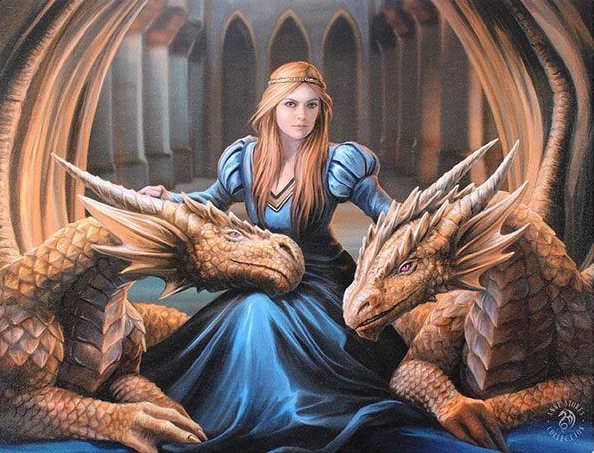 Reproduction sur toile d'une illustration de l'artiste Anne Stokes représentant une Elfe entourée de deux Dragons gardiens.