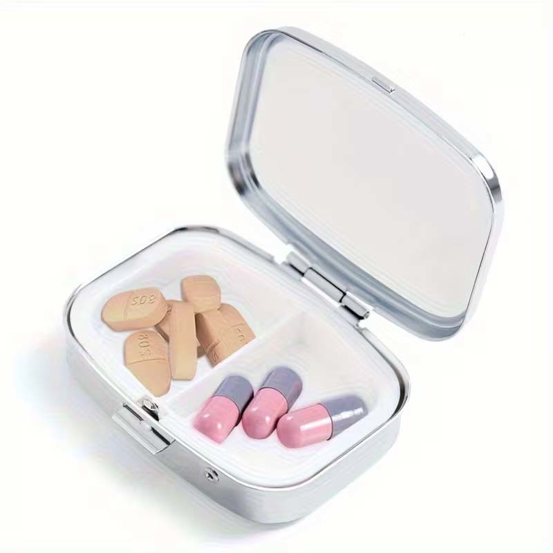 Boîte à pilules métallique rectangle avec 2 compartiments séparés et ouverture au moyen d'un bouton poussoir.