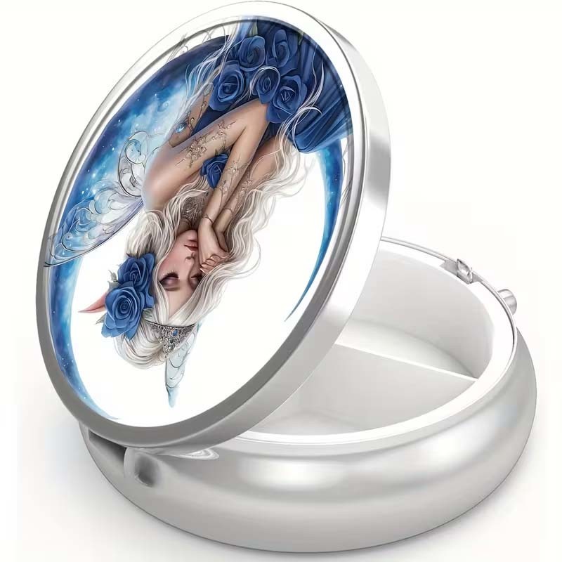 Boîte à pilules métallique ronde avec 3 compartiments séparés et ouverture au moyen d'un bouton poussoir.