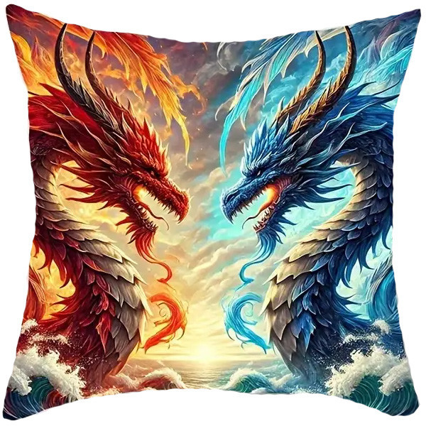 Coussin avec une housse amovible sérigraphiée sur une seule face avec une illustration représentant l'affrontement entre deux Dragons.
