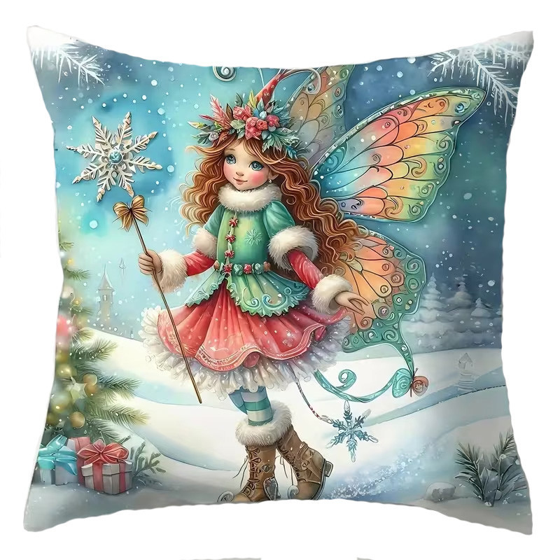Coussin avec une housse amovible sérigraphiée sur une seule face avec une illustration représentant une petite Fée de Noël.