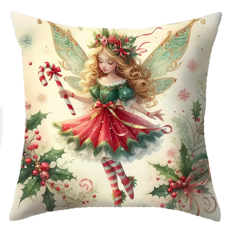 Coussin avec une housse amovible sérigraphiée sur une seule face avec une illustration représentant une petite Fée de Noël.