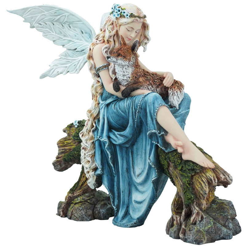 Grande figurine de Fée assise sur une branche avec un renard dans les bras.