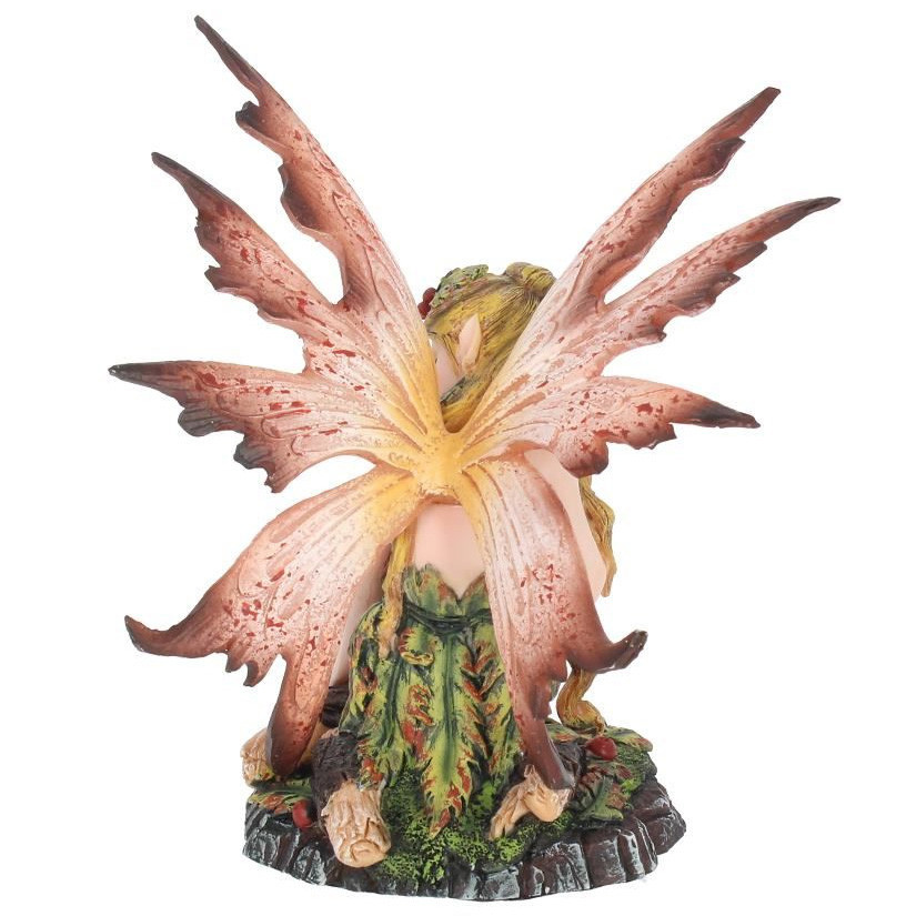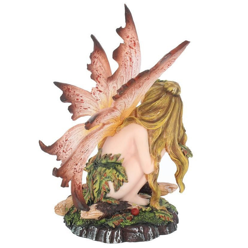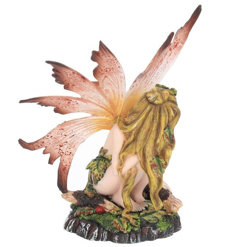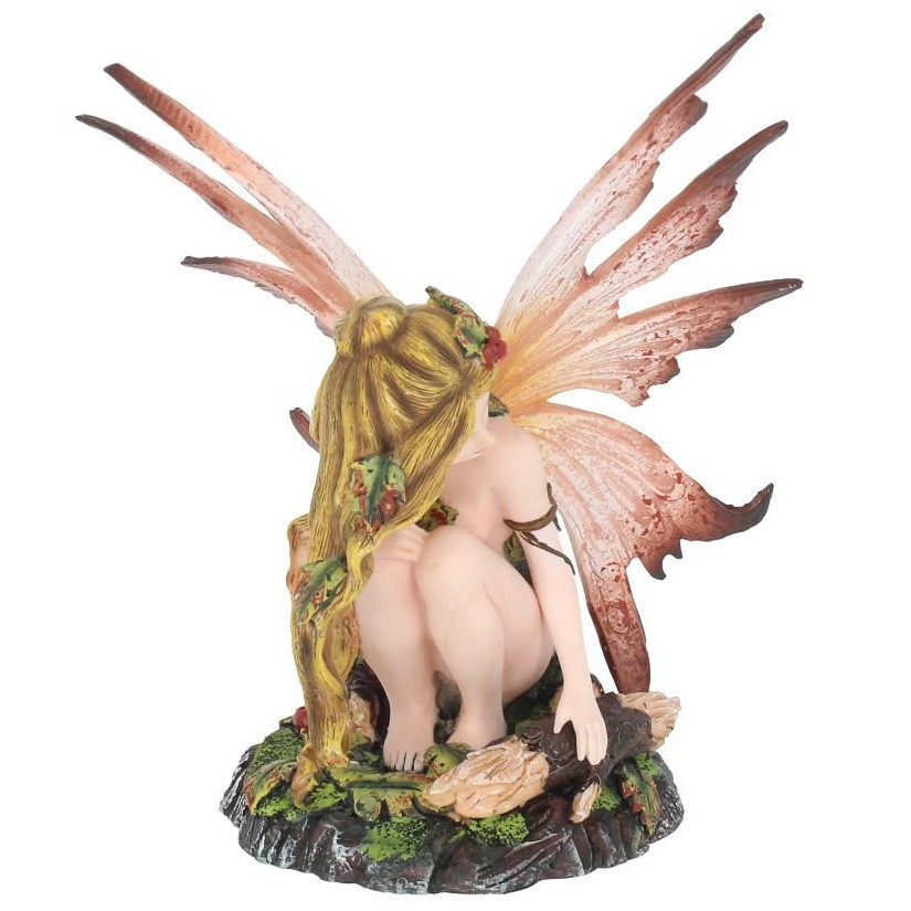 Figurine de Fée vêtue de feuilles et accroupie à côté d'une branche.