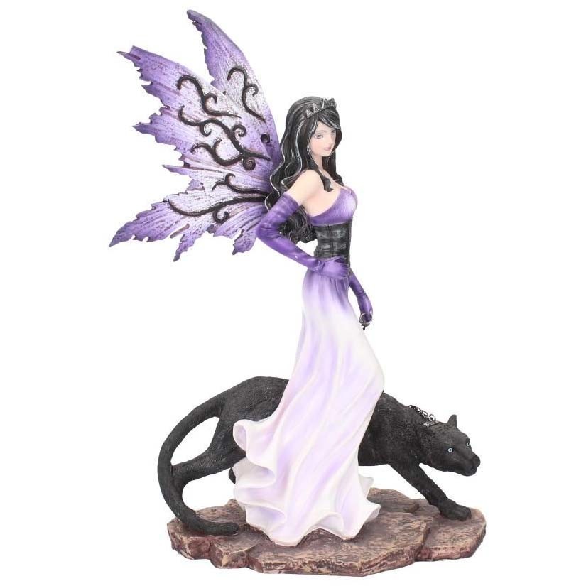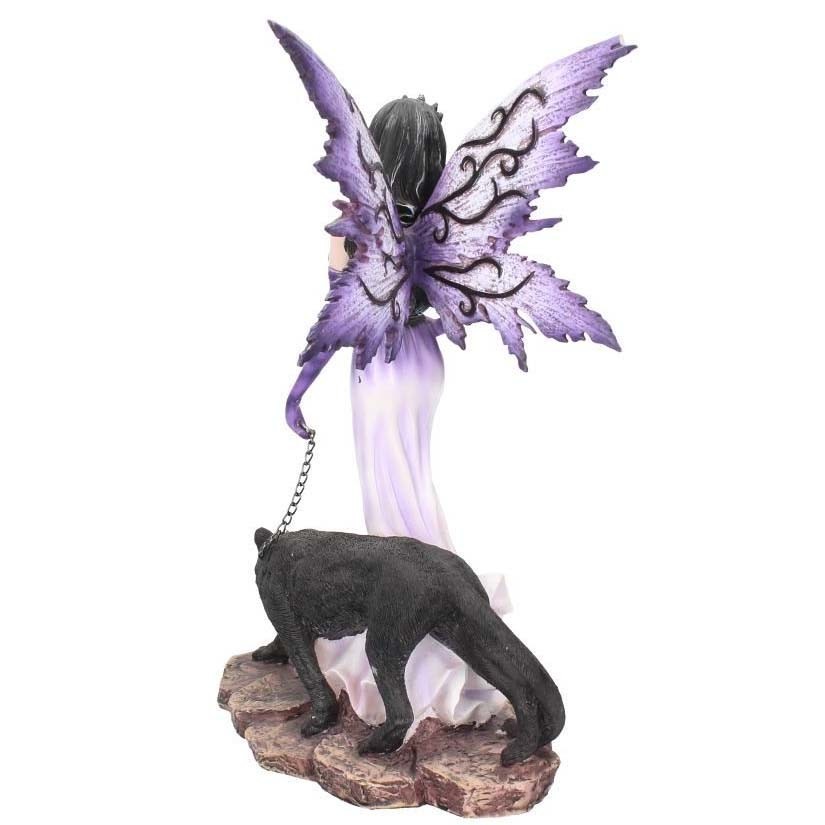 Grande figurine de Fée tenant une panthère noire en laisse.
