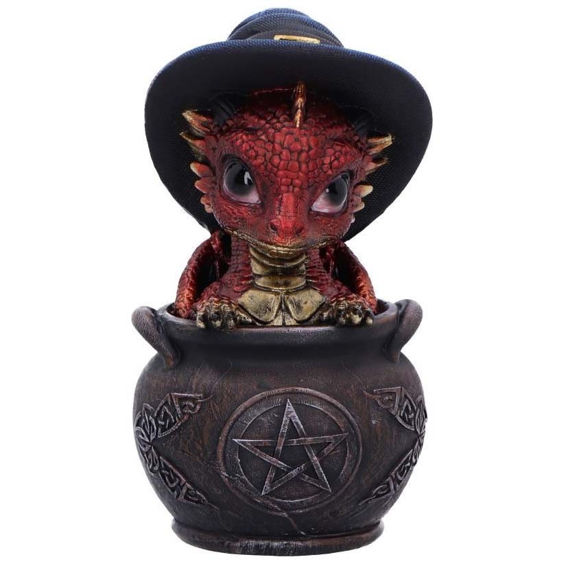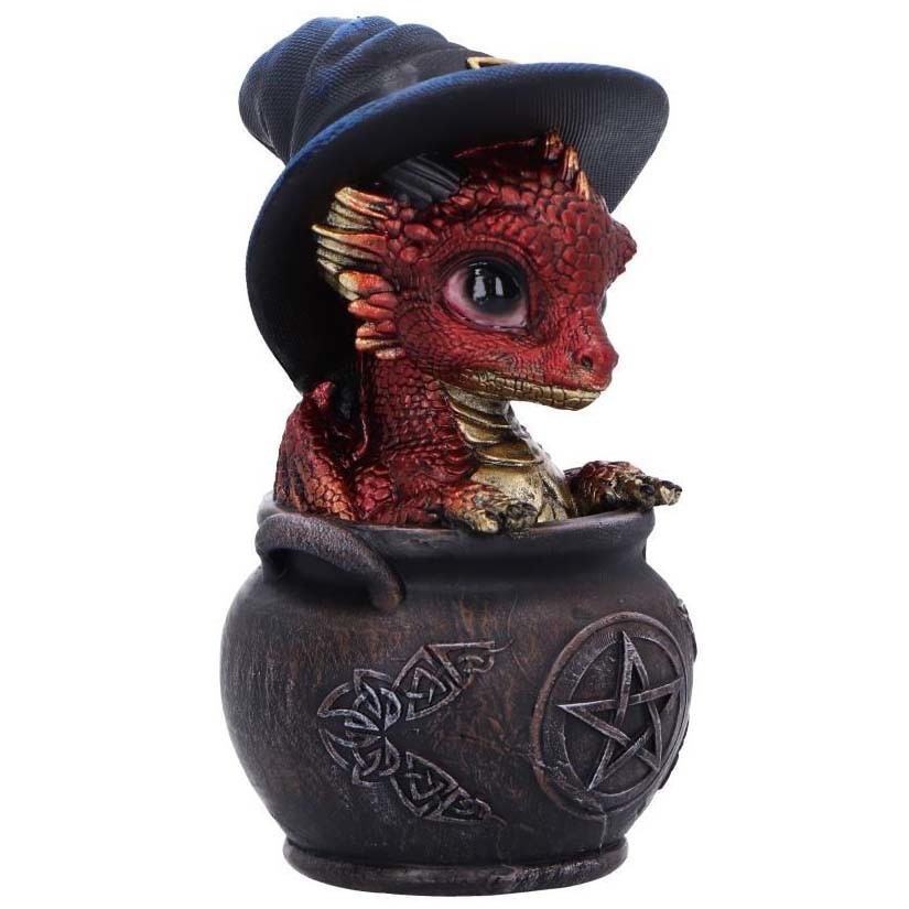 Figurine représentant un petit Dragon avec un chapeau de sorcier dans un chaudron.