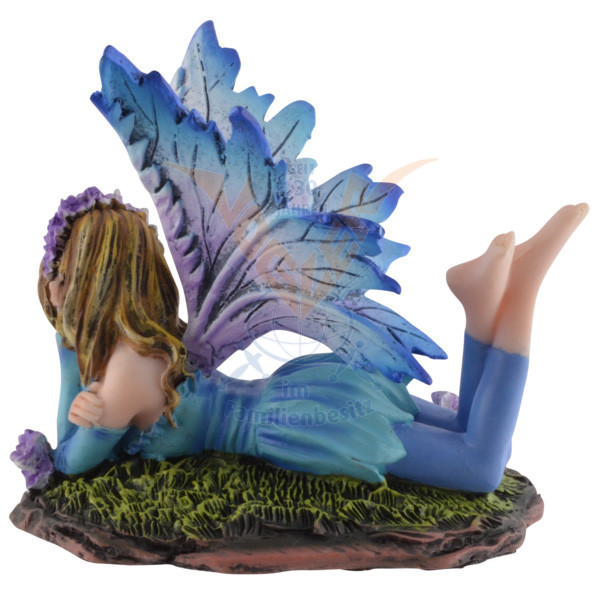 Figurine de Fée allongée au milieu de fleurs.