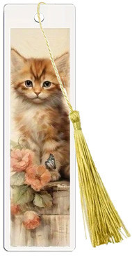 Marque-page souple en acrylique transparent avec une illustration de chat et un pompon à frange.