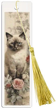 Marque-page souple en acrylique transparent avec une illustration de chat et un pompon à frange.
