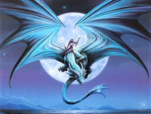Reproduction sur toile d'une illustration de l'artiste Anne Stokes représentant une Elfe mage chevauchant un Dragon sous la pleine lune.