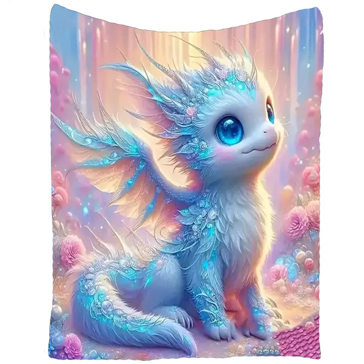 Plaid en flanelle souple 200-250g/㎡ avec une illustration sur le devant représentant un adorable petit Dragon.