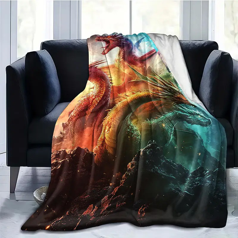 Plaid en flanelle souple 200-250g/㎡ avec une illustration sur le devant représentant une horde de Dragons.