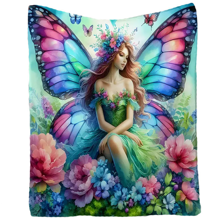 Plaid en flanelle souple 200-250g/㎡ avec une illustration sur le devant représentant une Fée avec des ailes de papillon.