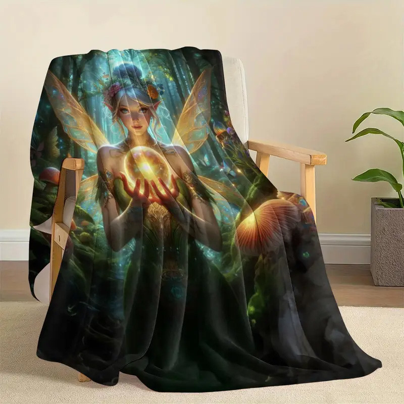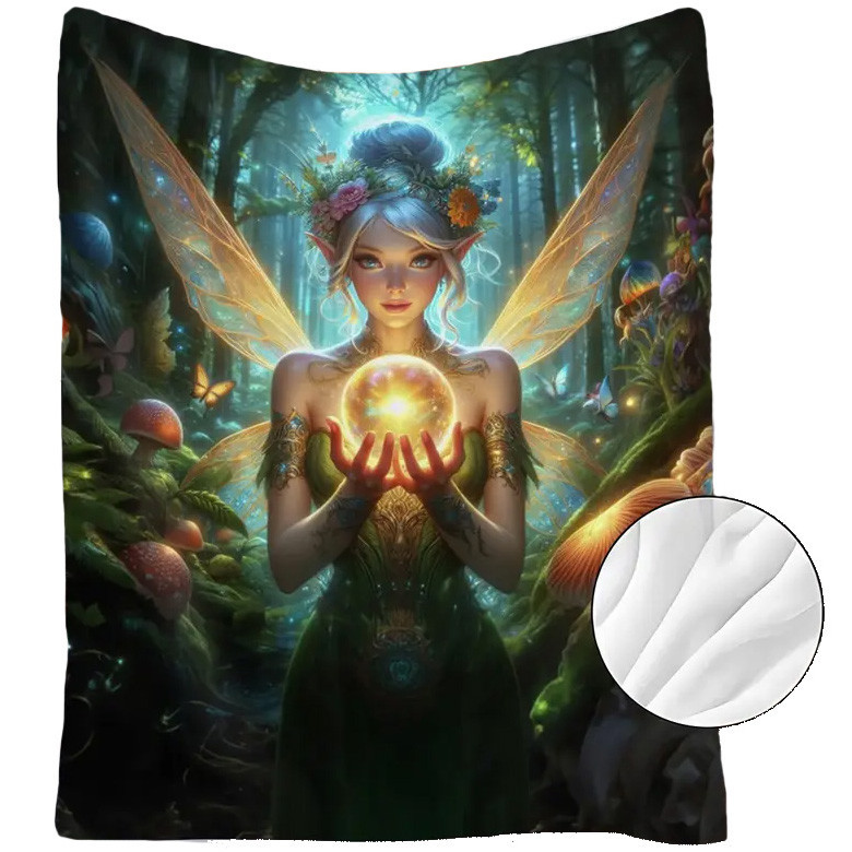 Plaid en flanelle souple 200-250g/㎡ avec une illustration sur le devant représentant une Fée de la forêt.