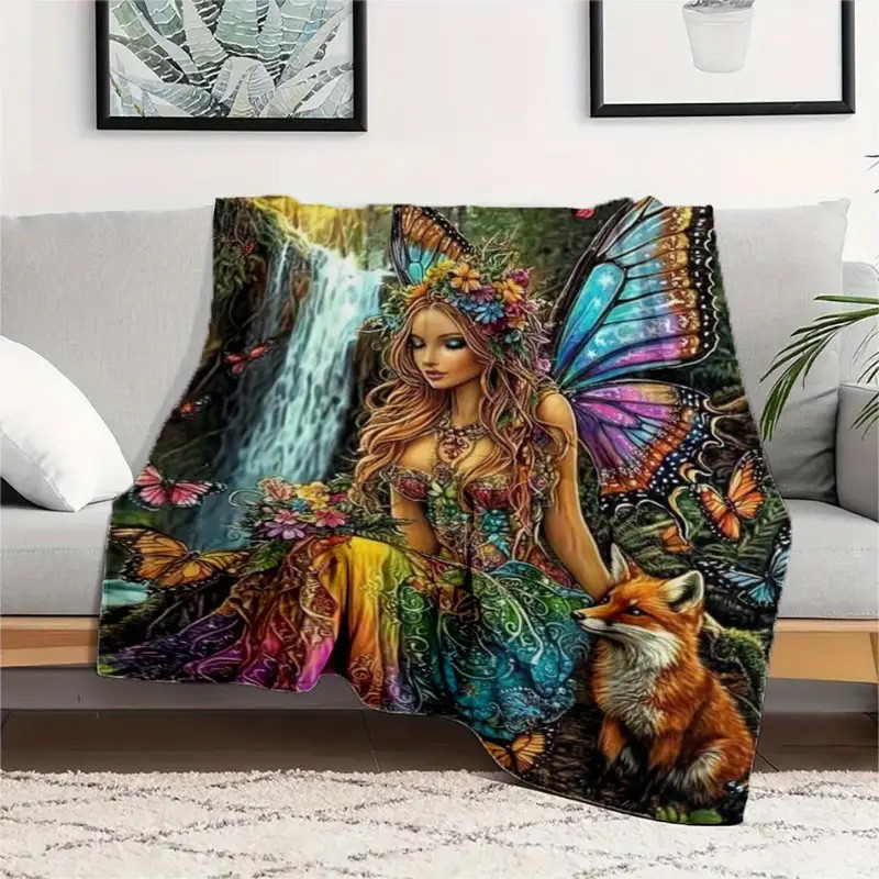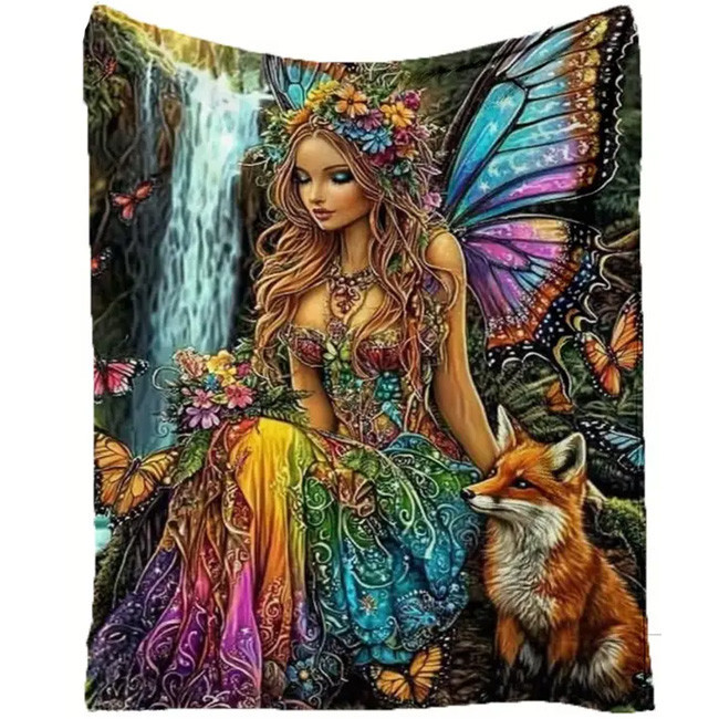 Plaid en flanelle souple 250-300g/㎡ avec une illustration sur le devant représentant une Fée très colorée accompagnée d'un renard.