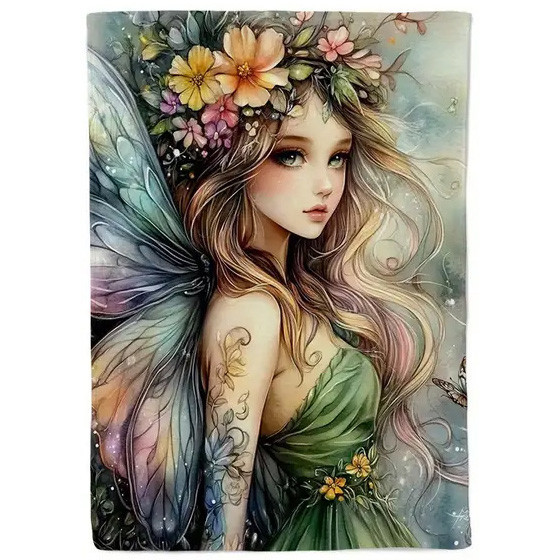 Plaid en flanelle souple 200-250g/㎡ avec une illustration sur le devant représentant une Fée avec une couronne de fleurs.