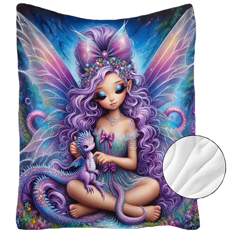 Plaid en flanelle souple 200-250g/㎡ avec une illustration sur le devant représentant une petite Fée aux ailes scintillantes.