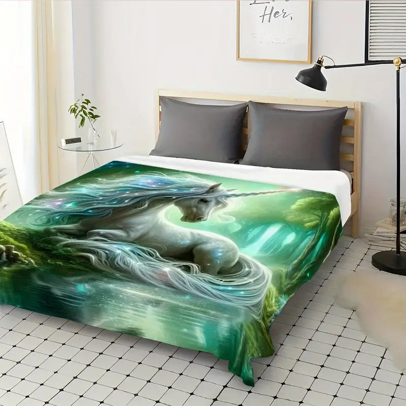 Plaid en flanelle souple 200-250g/㎡ avec une illustration sur le devant représentant une Licorne couchée auprès d'un étang.