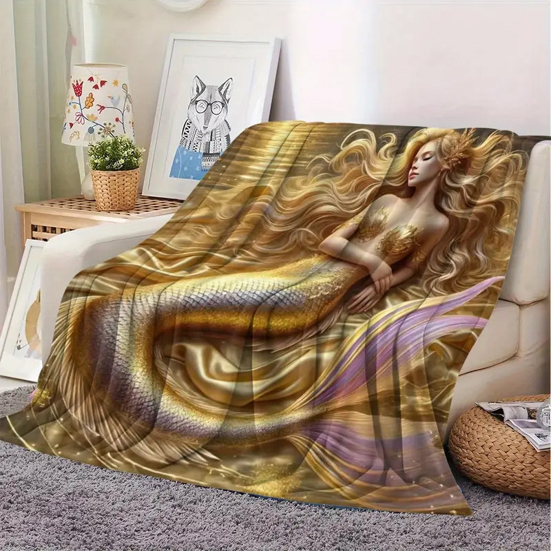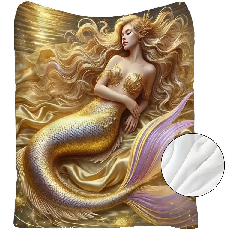 Plaid en flanelle souple 200-250g/㎡ avec une illustration sur le devant représentant une magnifique Sirène dans les tons dorés.