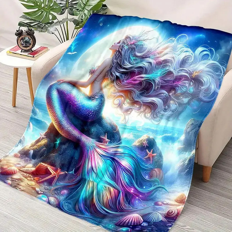 Plaid en flanelle souple 200-250g/㎡ avec une illustration sur le devant représentant une magnifique Sirène aux reflets multicolores.